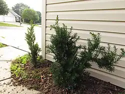 Two immature Taxus media var. hicksii yews planted in central Indiana, United States of America. Although T. media are slow-growing, the specimen on the right may require pruning within 2–3 years in order to avoid blocking the nearby sidewalk. | |