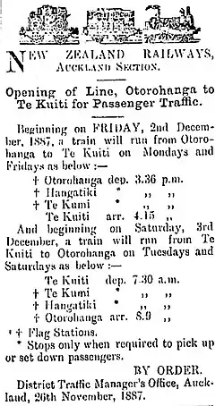 Te Kumi railway station opened with the section from Ōtorohanga to Te Kuiti, for which Coates & Metcalfe were the contractors,[9] having started work in 1886.[10] It opened on 2 September 1887 for goods[11] and three months later for passengers,[12] initially with two trains a week.[13] £122.1s was spent on creating a shelter shed and platform for a flag station at Te Kumi. Urinals were added in 1897, a 22 ft (6.7 m) by 14 ft (4.3 m) goods shed in 1899[14] (though possibly in use from 1897),[15] cattle and sheep yards and a passing loop for 22 wagons, in 1905, and a loading bank in 1911. Railway houses were built in 1920.[14]