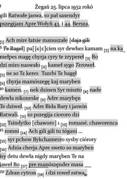 The manuscript of Tears of Blood was found among Papusza's papers. It turned out to be four times longer than the fragment published in 1956. This fact necessitated to drop the previous project in favor of transcribing and translating the actual Roman original, as preserved in the manuscript. Roma history specialist Volha Bartash[15] joined the team, alongside Viktor Shapoval, who specializes in Romani linguistics and culture.