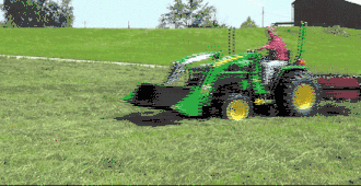 In an early, simple hay tedder described in 1852 and manufactured in Edinburgh by the company of Mr. Slight, the two wheels, via a spur wheel and a pinion, drive a set of light wheels, the "rake wheels"; on these two rake wheels are mounted eight rakes, which pick up and disperse the hay.[10] A later "English hay-tedder" uses two separate cylinders with rotating forks that can be reversed to lay the hay down lightly for improved exposure to air.[11]