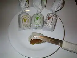 A teja (Spanish pronunciation: [ˈtexa]) is a dumpling-shaped confection from the Ica Region of Peru. It contains manjar blanco filling (similar to dulce de leche) and either dried fruits or nuts. The exterior is usually a sugar-based fondant-like shell,[1] but there also exists chocolate versions too (known by the blend chocotejas).[2]