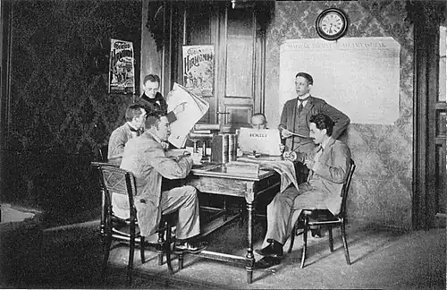 In 1901, the Telefon Hírmondó employed about 180 people during winter and 150 in the summer.[5] The staff consisted of a business manager, an editor-in-chief, four assistant editors, and nine reporters. The only ladies among the staff were those who sang in the concerts. At this time the service employed six stentors in the winter: four for duty, and two for alternates. Due to the effort required to speak loudly into the transmitters, readers took turns of ten minutes each. The stentors had strong and clear voices with distinct articulation to maintain clarity of sound over the telephone lines. In the summer, four stentors sufficed. In cases where only two stentors were on duty, they took turns of half an hour maximum.[5] By 1907, the system had a staff of over two hundred people, including two business managers, two principal editors, six sub-editors, twelve reporters, and eight stentors.[13]
