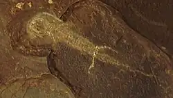 Very little is known of the soft tissue of temnospondyls because the conditions necessary to preserve such material are uncommon. The most extensive records come from fine-grained deposits in the Carboniferous and Permian of Germany; the small-bodied and aquatic dissorophoids and the larger stereospondylomorphs are frequently preserved with outlines of soft tissue around the skeleton.[115][116][117][118] Typically preserved features include the outline of the body, external gills, and parts of the eye or stomach. An amphibamiform specimen from the Mazon Creek locality was described as having toepad-like features.[119] The holotype specimen of Arenaerpeton supinatus from the Triassic of New South Wales, Australia, displays extensive soft tissue, hinting at the girth of the animal in life.[120] Trace fossils attributed to temnospondyls are fairly common, especially from the Carboniferous through the Triassic.[121][122][123][124][125][126] Common ichnogenera include Batrachichnus and Limnopus.