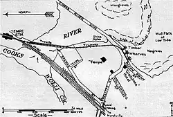 The contractors for the construction of the first 23-mile [37 km] section of the Illawarra Railway arranged with timber mills in the Port Stephens and Manning River districts for the supply of sleepers and other timber necessary for the construction. This material was brought down by sea to Botany Bay in schooners and small coastal steamers. The vessels anchored off the entrance to Cooks River and discharged their cargoes on to flat-bottomed punts. Tugs towed the laden punts along the channels of the river to the head of navigation at the Tempe Dam, near the present Princes Highway bridge. On the river bank, immediately to the south of the dam, the contractors erected three wharves where the timber was unloaded and placed on small 4-wheeled railway trucks for conveyance by horse teams, over a temporary tramway,[9] to the company's depot which was established about midway between St Peters and Sydenham railway stations. A large amount of material of all descriptions, including steelwork, for the railway bridge at Como, was also taken over the tramway from the depot to the wharves, where it was loaded on to a small paddle steamer for conveyance to Como via Botany Bay and Georges River.