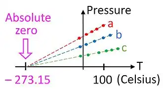 A material on which a macroscopically defined temperature scale may be based is the ideal gas. The pressure exerted by a fixed volume and mass of an ideal gas is directly proportional to its temperature. Some natural gases show so nearly ideal properties over suitable temperature range that they can be used for thermometry; this was important during the development of thermodynamics and is still of practical importance today.[17][18] The ideal gas thermometer is, however, not theoretically perfect for thermodynamics. This is because the entropy of an ideal gas at its absolute zero of temperature is not a positive semi-definite quantity, which puts the gas in violation of the third law of thermodynamics. In contrast to real materials, the ideal gas does not liquefy or solidify, no matter how cold it is. Alternatively thinking, the ideal gas law, refers to the limit of infinitely high temperature and zero pressure; these conditions guarantee non-interactive motions of the constituent molecules.[19][20][21]