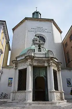 Other stories recall the sermon had been against a Patarine heresiarch Bonvillo, who denied the nature of the Eucharist, and that the altar in the tempietto served to support the Saint while he delivered his Sermon. The church is adjacent to the church of San Francesco di Paola and is echoed by the larger Sanctuary of Sant'Antonio behind the Tempietto.[2] St Anthony is also claimed to have performed a miracle in Rimini by preaching to fishes and having them congregate.[3]