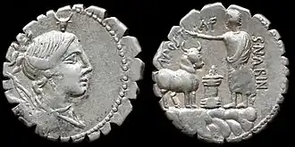 O: Diana with bow and quiver over the shoulder and bucranium above. Bucranium, skull of sacrificed bull, was displayed in the temple of Diana. | R: Sacrificing scene on the stone platform. Togate figure holding sprinkler is about to sacrifice bull, altar between them.
