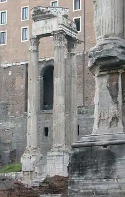 The temple suffered significant damage during medieval times, particularly c. 1300 (under Pope Boniface VIII), and in Pope Nicholas V's remodelling of the Forum (which involved the demolition of both angles of the temple on the Forum side and the reconstruction of its front as a fortress with corner towers).[6] All that survives today is the podium's core (with some of its peperino lining), parts of the cella (two fragments of its travertine wall and part of the pedestal at its back for the cult statues), and three Corinthian columns at pronaos's south-east corner.[1]