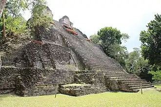 The Temple of the Owl is a Maya temple located in the ancient city of Dzibanche in Quintana Roo, Mexico, the first capital of the Kaan kingdom. The Temple of the Owl was built in the classic period of the Maya civilization around the 5th to 6th century as a funerary structure. Inside its pyramidal base is a three-level staircase leading to a burial chamber where the tomb of a royal woman of the Kaanu'l dynasty was found, which included a rich and extensive funerary trousseau of vessels, ceramics, bowls, obsidian blades and a large white shell (spondylus) inlaid with jade and carved with the image of a ruler. It receives the name of Temple of the Owl in reference to a polychrome ceramic vessel found inside the tomb of the temple decorated with a lid in the shape of the head of an owl, a bird that in the ancient Maya mythology was related to the night with the ability to travel between the world of life and death and that could guide the souls through their journey in the underworld. Archaeologically it is also known as the Temple I, Building 1 or E1 of Dzibanche.[1]