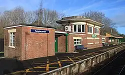 It was finally agreed that the station could be reopened on a three-year trial. The cost of works was kept to just £9,200 by TSWC members carrying out much of the work themselves. Reopening came on 3 October 1983.[3] The services proved so successful that a new waiting shelter was provided in 1988, and an extension with toilets was added two years later. A 'new' footbridge was erected to connect the platform with the car park; it had originally been erected in 1893 at Buxted.[4] The signal box doubles as a ticket office, and for many years the station was staffed full-time because of the need for a member of staff to operate the points and signals for the double track west of the station. After the commissioning of a new signalling system, controlled from Basingstoke, in March 2012, ticket office staffing hours were reduced. However, because the platform was only accessible by crossing the track, staff were still required to operate a level crossing for wheelchair users and other passengers unable to use the footbridge. To resolve this, the disused platform on the south side, where there is level access to the car park and streets beyond, was extended out across the disused trackbed up to the active set of tracks, and was provided with a basic shelter and lighting, an automatic ticket machine, and information boards.[5][6]