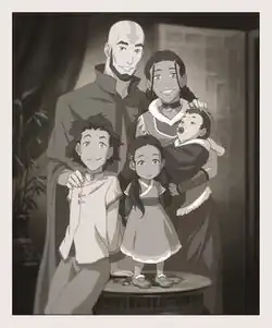 Tenzin has a longstanding friendship with Lin Beifong, who is the daughter of Toph Beifong, and at one point the two characters were romantically involved.[5] Tenzin offered her comfort and a higher level of trust was reached between the two. However, their romantic relationship deteriorated, partially because Tenzin wanted children while Lin did not and because of Lin's abrasive nature.[6] It was during this time that Pema, who was an acolyte of the Air Nation, approached Tenzin and confessed her feelings for him. This indirectly led to the end of Tenzin's romantic relationship with Lin and the beginning of his relationship with Pema. The two eventually married, and would have four children: Jinora, Ikki, Meelo and Rohan.