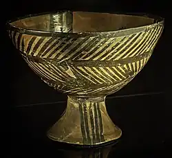 - Strata II (subdivided into IIA and IIB) - grey pottery. IIA featured wheelmade pottery with motifs similar to Strata IC while decoration changed somewhat in IIB. Strata II is the thinnest of the layers and assumed to have been the shortest occupation though this is not certain. Buildings construction and plan were similar to Strata I so this Strata is largely defined by pottery type. Small finds, lithics, figurines etc., were also similar to Strata I. More copper objects and types appeared including maceheads, rings, bracelets, anklets, earrings, and various tools. A few small gold and silver ornaments were found. Of the 209 burials excavated, those in IIA contained more and varied grave goods.