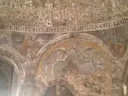 The "restorations" carried out by Guido Libertini in the 1950s led to the destruction of most of the frescoes that once covered the interior walls of the Church of Santa Maria della Rotonda. Nevertheless, the chancel still preserves fine medieval frescoes. The figures of two saints can be seen in the western apse (on the left hand side as you enter the chancel). The first one, on the right, represents St. Nicholas and dates back to the 12th century.[7] Other studies identify him as St Gregory Thaumaturgus, bishop of Neocaesarea, but this interpretation seems less likely. The second fresco, on the left, is certainly later (13th century) and represents St. Leo of Catania, also known as the Wonderworker – the caption Ο ΑΓΙΟΣ ΛΕΟΝ, in Greek characters, is clearly legible on the left.[7] Traces of an Annunciation, also from the 13th century, and fragments of Byzantine decorations can be seen on the eastern wall of the chancel.[7] The baroque frescoes at the base of the dome represent St. Peter, St. Paul, St. Agatha, and St. Lucy alongside the Evangelists Luke, Matthew, Mark, and John. Above these figures, a Latin inscription reads: