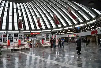 Terminal de Autobuses de Pasajeros de Oriente (Eastern Passenger Bus Terminal), better known by the acronym TAPO, is an inter-city bus station in Mexico City. It is located next to and conjoined with the San Lázaro metro station, in the Venustiano Carranza borough in the eastern part of Mexico City.[1] Designed by architect Juan José Diaz Infante Núñez, it is marked by its very large dome covering the structure. The outer rim of the circular interior contains ticket counters and boarding areas for bus lines. The center contains a food court and other businesses.[2]