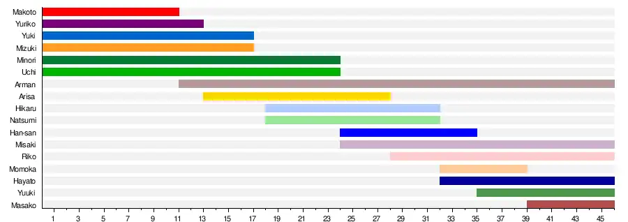 01 | Makoto Hasegawa | 長谷川慎 | Makocchan | university student/baseball player | November 21, 1993 | 22 | 01–11 | 11 |