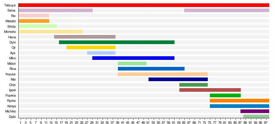 01 | Tetsuya Sugaya | 菅谷哲也 | Tecchan, Tetsu | aspiring firefighter | July 28, 1993 | 1–98 | 98 |