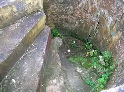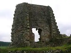 The small, irregular, octangular 14th-century vaulted tower has a splayed base[4][5] and is constructed of courses of square ashlar masonry,[6] 6 m (20 ft) high, with walls 2 metres (6.6 ft) thick, is the earliest part of the structure, together with the wide wall at the north-west. The tower was vaulted, with three ribs, and an entrance from the courtyard via a narrow passage leading to a partly surviving wheel-stair.[4] The remains of outbuildings lie to the north and a well was recorded within the keep; a sizeable courtyard lay within the complex.[7] The remains have seen some restoration[8] and the lines of excavation trenches are apparent. The whereabouts of the records of the late 19th-century excavations is not known for certain.[9]