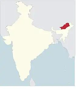 Diocese of Itanagar | Arunachal Pradesh: Tawang, West Kameng, East Kameng, Papum Pare, Upper Subansiri, Lower Subansiri, Kurung Kumey, West Siang, East Siang and Upper Siang | ![]() Map showing the location of the Diocese of Itanagar in India |