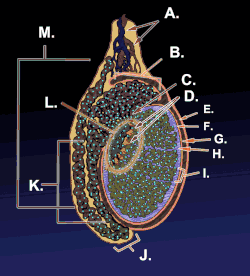 ![]() Diagram of inner structures of a human testicle (the labelling "seminal vesicle lobules" is incorrect and should be "testicular lobules" instead) | |