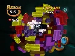 In most Tetris titles, a player's score is incremented by completing "lines", where a row of brick pieces without gaps is removed from the 2D playing field. This action both earns points and clears the completed row, creating space for additional pieces. However, in Tetrisphere, the objective is to remove bricks by causing three pieces of the same type to touch as a result of a "drop". A drop occurs when any brick falls, either directly from the player releasing the currently held brick or when the supporting brick below it is removed by any means.