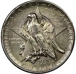 In early March 1935, examples of the coin were presented both to President Roosevelt and to Vice President John Nance Garner.[31] Civic organizations and other groups joined the Legion in selling the coins; Amarillo had a quota of 5,000 half dollars.[32] By the end of February, residents of Paris, Texas, had bought 95 of their city's quota of 100 coins.[33]