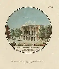 The company was granted to a man by the name of Texier (or Teissier) who had Abraham, one of the dancers from the Opera, as his partner.[3] In 1777, Mr. Texier, aiming to profit from the students of the Conservatory at the Académie Royale de Musique, began construction of the new theatre. It was built by October 1778.[4] The opening of the theatre was announced for 1 September but was delayed by lack of funds until 7 January 1779.[3]