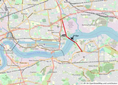 It was planned that the bridge should be built by 2013 and would have connected Beckton in the London Borough of Newham with Thamesmead in the Royal Borough of Greenwich linking the A406/A13 junction in Beckton with the A2016 Eastern Way and Western Way in Thamesmead and serve the new Thames Gateway development.