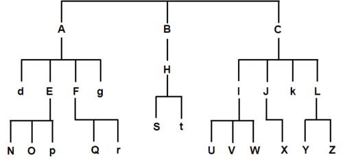 A typical tharavadu reproduced from K. M. Panikkar's article published in 1918. Capital and small letters represent females and males respectively. Supposing that the females A, B and C were dead and the oldest male member karnavar being d, if the male members t, k and others demanded partition, the property would be divided into three parts.