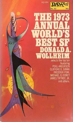 The 1973 Annual World's Best SF is an anthology of science fiction short stories edited by Donald A. Wollheim and Arthur W. Saha, the second volume in a series of nineteen. It was first published in paperback by DAW Books in May 1973, followed by a hardcover edition issued in August of the same year by the same publisher as a selection of the Science Fiction Book Club. For the hardcover edition the original cover art of Jack Gaughan was replaced by a new cover painting by William S. Shields. The paperback edition was reissued by DAW in December 1978 under the variant title Wollheim's World's Best SF: Series Two, this time with cover art by Larry Oritz.
