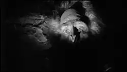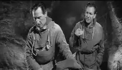 It was Val Guest's view that the Yeti should be kept largely off-screen, bar a few glimpses of hands and arms, leaving the rest to the audience's imagination.[22] By contrast, Nigel Kneale felt that the creatures should be shown in their entirety to get across the message of the script that the Yeti are harmless, gentle creatures.[22] In the climactic scene where Rollason comes face to face with the Yeti, their bodies are silhouetted and only the eyes are seen close up and distinctly: Guest used Fred Johnson to play the Yeti in this scene, relying on his "eyes of worldly understanding" to convey the benign nature of the Yeti.[38]