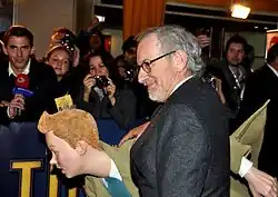 Steven Spielberg became an avid fan of The Adventures of Tintin in 1981 after a review compared Raiders of the Lost Ark to the comics.[12] Meanwhile, Hergé—who disliked the previous live-action film versions and the Hergé's Adventures of Tintin animated series—became a fan of Spielberg. Michael Farr, author of Tintin: The Complete Companion, recalled Hergé "thought Spielberg was the only person who could ever do Tintin justice".[18] Hergé had been looking to use the medium of film to make Tintin more current, as he felt that the animated films Tintin and the Temple of the Sun and Tintin and the Lake of Sharks had failed to capture the essence of the books.[19] Spielberg and his production partner Kathleen Kennedy of Amblin Entertainment were scheduled to meet with Hergé in 1983 while filming Indiana Jones and the Temple of Doom in London. Hergé died that week, but his widow Fanny Remi decided to give them the rights.[12] A three-year-long option to film the comics was finalized in 1984,[18] with Universal Pictures as distributor.[20]