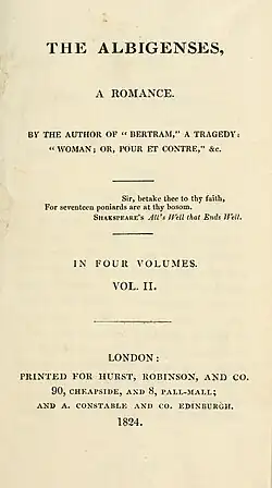 The Albigenses is an 1824 gothic historical novel by the Irish writer Charles Maturin, published in four volumes by Hurst, Robinson, and Company in London and Constable in Edinburgh.[1] It was published in the year of his death, and was his final novel followed by the short story Leixlip Castle (1825). The plot is set in the early thirteenth century based on the Catharists of Southern France, also known as Albigenses, after the town of Albi.[2] Maturin, a Church of Ireland clergyman, was known for his Gothic novels and plays. Inspired by the success of Walter Scott's Waverley novels, he turned to historical fiction and the novel bears particular similarities with Scott's Ivanhoe.[3]