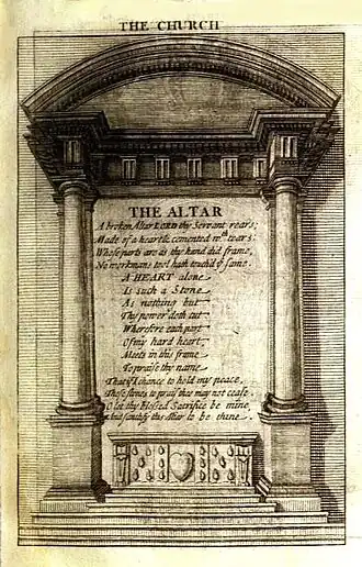 In the Cambridge editions, the positioning of "The Altar" in the book emphasizes the beginning of The Church section, appearing on the left-hand page opposite the opening of the related "The Sacrifice". By the London 8th edition of 1670, however, the page's left-hand side is devoted to the poem "Superliminare" and appears at the foot of a Baroque-style doorway, a design which fills most of the page, illustrating the title's meaning of 'on the threshold'. "The Altar" is now on the right-hand page, framed by a Baroque archway over a substantial stone altar with steps leading up to it at its foot. The word Altar only appears capitalized in the title but not elsewhere; in the poem itself the word LORD in the first line is given reverential capitalization but otherwise only the word HEART in the fifth line is capitalized.[7] By the 10th edition of 1674 the text of the poem is uncomfortably constricted within an elaborate archway and has the word heart alone spelt in capitals in the fifth line.[8] It has been argued that these later changes in the poem's presentation reflect ecclesiastical attitudes in the re-established Anglican church after the Stuart Restoration - and even an attempt to re-evaluate the significance of poet's ministry.[9]