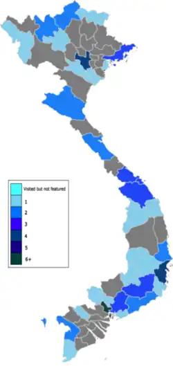 As of 2019, The Amazing Race Vietnam has visited 4 municipalities and 30 provinces in Vietnam, in addition to 6 foreign countries in 2 continents.
