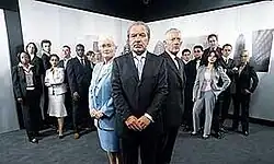 Promo group shot of Alan Sugar, Nick Hewer, and Margaret Mountford standing before the candidates for series 1 | |