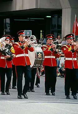 The Band of The Royal Regiment of Canada is a Canadian military band that serves as the official regimental band of the Royal Regiment of Canada. It is the oldest permanently organised band in the Canadian Forces. It is based at Fort York in Toronto and is assigned to the part of 4th Canadian Division's 32 Canadian Brigade Group. The ceremonial dress uniform of the band is that of the former Canadian Guards regiment, a scarlet tunic and bearskin with a red-over-white plume.[1][2]