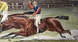 The Bard was undefeated as a two-year-old, winning 16 races including the Brocklesby Stakes, and £9188 in prize money.[3] His record for the most wins in a season by a British juvenile was not equaled until Provideo won 16 times in 1984.[4] In his first race as a three-year-old he faced 2000 Guineas winner Ormonde in the 1886 Epsom Derby. Ormonde was the 40/85 favourite and The Bard was the 7/2 second favourite. Halfway down the finishing straight The Bard, ridden by Charles Wood, was slightly in front of Ormonde, but as soon as Ormonde's jockey asked for an effort he went clear. Ormonde went on to win the race by 1½ lengths from The Bard, who was about 10 lengths clear of St. Mirin in third.[5][6] The Bard then won the Goodwood Cup in a walkover[3] and won the Doncaster Cup.[7]
