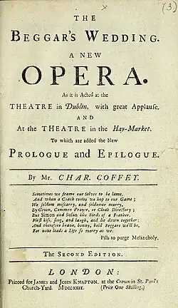 The Beggar's Wedding is a 1729 ballad opera by the Irish writer Charles Coffey. Part of a boom in ballad operas following the success of John Gay's The Beggar's Opera, it originally premiered at the Smock Alley Theatre in Dublin in March 1729 before appearing in London at the Haymarket Theatre on 29 May 1729[1] The original Dublin cast included Richard Elrington.