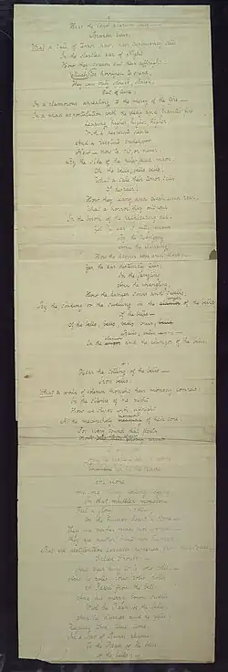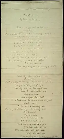 The sounds of the verses, specifically the repetitive "bells, bells, bells, bells, bells, bells, bells", lie on a narrow line between sense and nonsense, causing a feeling of instability.[2] Poe uses – and popularised – the word "tintinnabulation", often wrongly thought to be his own coinage,[3] based on the Latin word for "bell", tintinnabulum.[4] The series of "bells" echo the imagined sounds of the various bells, from the silver bells following the klip-klop of the horses, to the "dong, ding-dong" of the swinging golden and iron bells, to screeching "whee-aaah" of the brazen bells. The series are always four, followed by three, always beginning and ending on a stressed syllable. The meter changes to iambic in the lines with repeated "bells", bringing the reader into their rhythm. Most of the poem is a more hurried trochaic tetrameter.[5]
