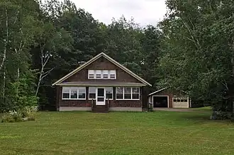 The Birches stands on the east side of Foster Lane, a short way south of its northern end at Lakeshore Drive, and about 0.15 miles (0.24 km) south of that road's junction with Maine State Route 27. It is a rectangular 1+1⁄2-story wood-frame structure, with a gabled roof and shingled exterior. Its main facade faces northwest, with an enclosed single-story hip-roofed porch extending across its width. The southwest roof face is adorned with an eyebrow dormer, and a fieldstone chimney rises through the northeast roof face. The interior has a large two-story living room, finished entirely in original varnished tongue-and-groove woodwork. A balcony runs around all four sides, with a stair rising along the wall dividing the room from bedrooms and bathrooms.[2]