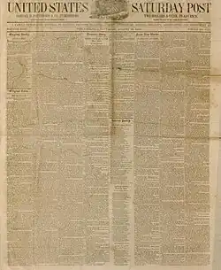 "The Black Cat" was first published in the August 19, 1843, issue of The Saturday Evening Post. At the time, the publication was using the temporary title United States Saturday Post.[4] The story was reprinted in The Baltimore Sun and The Pensacola Gazette that same year.[5] Readers immediately responded favorably to the story, spawning parodies including Thomas Dunn English's "The Ghost of the Grey Tadpole".[6]