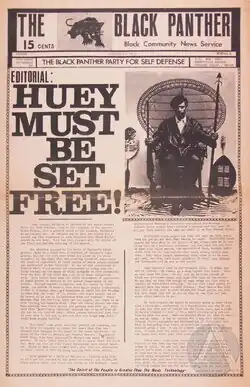 The Black Panther (also called The Black Panther Intercommunal News Service, Black Panther Black Community News Service, and Black Community News Service) was the official newspaper of the Black Panther Party. It began as a four-page newsletter in Oakland, California, in 1967, and was founded by Huey P. Newton and Bobby Seale.[1] It was the main publication of the Party and was soon sold in several large cities across the United States, as well as having an international readership. The newspaper distributed information about the party's activities, and expressed through articles the ideology of the Black Panther Party, focusing on both international revolutions as inspiration and contemporary racial struggles of African Americans across the United States.[2] It remained in circulation until the dissolution of the Party in 1980.