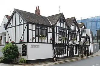 In the late 18th century, the house was converted into a pub, although much of its interior survives intact from the 1670 alterations, particularly in the entrance hall, the Smoke Room, and a room upstairs with a trompe l'oeil painting. Externally, the central section of the facade is timber-framed with a jettied first floor, dating from 1560. To its right is a brick and timber extension from 1670, and to the left, an extension built in 1940, with a wing of 1670 behind.[1][2][3]