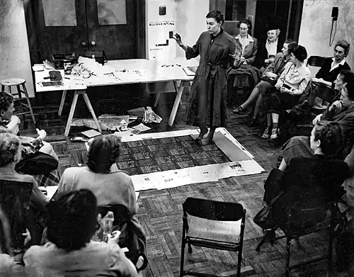 The Blockhouse of Boston was a pioneering art and design cooperative of alumni from the Massachusetts College of Art in Boston, Massachusetts that opened its doors in 1947.[1] Blockhouse artisans, primarily the then-recent art school graduate Janet Doub Erickson, designed and produced original textiles including draperies, wall hangings, table linens, costume treatments and other art. The co-op specialized in linoleum blockprints — also known as linocuts — and screen printing. Blockhouse was known for original use of New England themes and motifs intermingled with bold ethnic designs [2] at times inspired by pre-Columbian art and sometimes with modernist motifs.[3] As a journalist described some of Blockhouse principal designer Janet Doub Erickson's inspirations in a 1952 profile, "she goes to New Guinea for her motif, 'Checkerboard,' to China for her "Quan-Yin" design, to Guatemala for "Mayan Stele," and to a Northwest Indian reservation for "Totemotif."[4]
