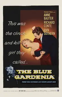 The Blue Gardenia is a 1953 American film noir starring Anne Baxter, Richard Conte, and Ann Sothern. Directed by Fritz Lang from a screenplay by Charles Hoffman, it is based on the novella The Gardenia by Vera Caspary.[1]
