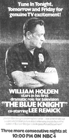 The Blue Knight is a 1973 television and theatrical film adapted from Joseph Wambaugh's 1973 novel The Blue Knight. It inspired the 1975 TV series also titled The Blue Knight. The miniseries was broadcast on NBC TV in November 1973, consisted of four one-hour episodes (including commercials), was directed by Robert Butler, and featured an all star cast headed by William Holden as Police Officer Bumper Morgan. The additional cast includes Lee Remick, Eileen Brennan, Sam Elliott, Joe Santos, and Vic Tayback. It was later released as a film in condensed form.