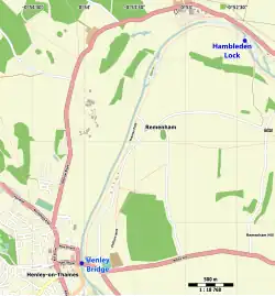The course for the race was a 2.25-mile (3.62 km) stretch of the River Thames between Hambleden Lock and Henley Bridge.[14] Cambridge won the toss and elected to start on the Berkshire side of the river, handing the Buckinghamshire side to Oxford.[15] According to the author William Fisher MacMichael, "it was as fine a day as our climate allows a June day to be."[14] The race had originally been scheduled to start at 6:00 p.m. but this was altered to 7:00 p.m. and was further delayed. Upon the start of the race, by which time around 20,000 people were reckoned to be in attendance to watch, the Oxford boat was steered close to the Cambridge boat, forcing it to row close to the shore. This drew complaints from the Cambridge crew, who insisted that the race be restarted. The Oxford crew relented, and the race began for the second time at 7:55 p.m.[16] In the early stages of the race, the two crews were evenly matched, but after they passed an island in the river, Oxford drew ahead.[6]