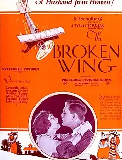 The Broken Wing is a 1923 American silent aviation comedy drama film directed by Tom Forman based on the play The Broken Wing by Paul Dickey and Charles W. Goddard.[1] The film stars Kenneth Harlan, Miriam Cooper, and Walter Long. The Broken Wing was released on August 19, 1923.[N 1].[3]