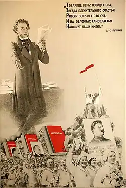 Pushkin's poem became particularly significant during the Soviet era. Pushkin depicted Peter as a strong leader, so allowing Soviet citizens to praise their own Peter, Joseph Stalin.[26] Stalin himself was said to be "most willingly compared" to Peter the Great.[27] A poll in Literaturnyi sovremennik in March 1936 reported praise for Pushkin's portrayal of Peter, with comments in favour of how The Bronze Horseman depicted the resolution of the conflict between the personal and the public in favour of the public. This was in keeping with the Stalinist emphasis of how the achievements of Soviet society as a whole were to be extolled over the sufferings of the individual.[26] Soviet thinkers also read deeper meanings into Pushkin's works. Andrei Platonov wrote two essays to commemorate the centenary of Pushkin's death, both published in Literaturnyi kritik. In Pushkin, Our Comrade, Platonov expanded upon his view of Pushkin as a prophet of the later rise of socialism.[28] Pushkin not only 'divined the secret of the people', wrote Platonov, he depicted it in The Bronze Horseman, where the collision between Peter the Great's ruthless quest to build an empire, as expressed in the construction of Saint Petersburg, and Evgenii's quest for personal happiness will eventually come together and be reconciled by the advent of socialism.[28] Josef Brodsky's A Guide to a Renamed City "shows both Lenin and the Horseman to be equally heartless arbiters of other's fates," connecting the work to another great Soviet leader.[29]