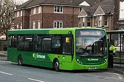 Some buses allocated to The Buses of Somerset carry FirstGroup corporate liveries but a local brand identity and livery is carried by most of the fleet. When this appeared it was the first major departure from the FirstGroup corporate identity and livery which was previously applied almost universally across the group's bus operations. The business instead now uses a two tone green and cream livery with bespoke branding, website and social media profiles.[1][5] Buses allocated to Taunton town services were branded 'The Buses of Taunton' but using the same livery as other buses in the fleet.